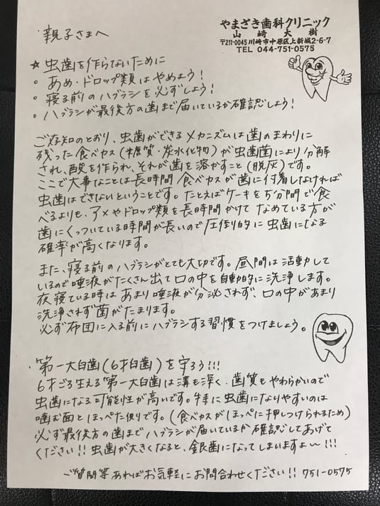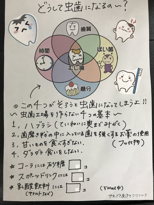 川崎市立大谷戸小学校の小学校三年生のクラスで、山崎歯科クリニックの院長先生と、歯科衛生士・歯科助手のスタッフが歯磨き指導を行いました。その時使ったプリントです