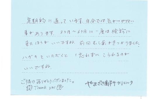 定期的に通っています。自分では気がつかないことがあります。3~6ヶ月に一度は検診に来た方が良いですね。