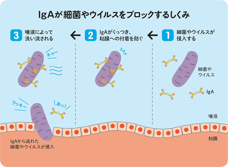 口腔の免疫は、IgA(※)という抗体が働き、害を及ぼす微生物を排除してくれる粘膜免疫というシステムで実行されています。